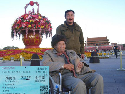 京福高鐵淮南東站開通運(yùn)營后,王登倫老人從新聞中得知,乘高鐵從淮南到北京只需3個多小時,更令老人欣喜的是,從田家庵區(qū)直通高鐵淮南東站的公交車G2正好從大通區(qū)居仁村經(jīng)過,老人走出家門步行百米左右,即可坐上G2公交車。老人想去北京的心,再次澎湃了,這期間老人又從新聞中得知,黨的十八大即將于11月初在北京召開,對黨情深的王登倫再也壓制不住心底的夢想了,他告訴子女:自己要在十八大召開前,坐高鐵去首都北京看一看。王登倫的子女們聽后同意了老人的想法,10月29日,老人在淮南吃過午飯,在兒子的陪伴下坐上G2公交車到高鐵淮南東站,踏上了他第一次的北京之旅。
