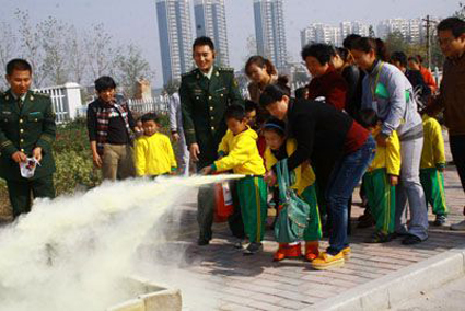 圖為消防官兵指導(dǎo)幼兒及家長正確使用滅火器。