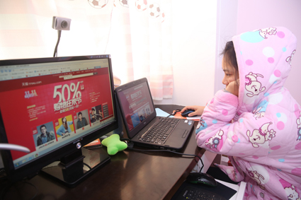 11月11日,一年一度的雙十一電商促銷大戰(zhàn)再次打響。很多熱愛網(wǎng)購的市民已躲在家里連夜奮戰(zhàn)。一位喜愛網(wǎng)購的市民在微博里寫到:“本月獎(jiǎng)金已全部沖入支付寶,備戰(zhàn)雙十一”。另一位網(wǎng)民在QQ個(gè)性簽名里寫到:“夜戰(zhàn)雙十一,真心傷不起,寶貝幾秒鐘就被搶光了!睋(jù)阿里巴巴統(tǒng)計(jì)數(shù)據(jù)顯示,11月11日零點(diǎn)后10分鐘,天貓和淘寶共成交2.5億元,相較去年第8分鐘成交額破億,增長(zhǎng)明顯。圖為市民宅在家中熬戰(zhàn)雙十一的情景。