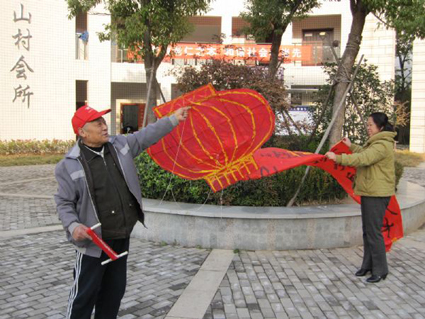 記者看到這些風箏,燈籠和雄雞等形狀的風箏全部都是老人從廢舊的橫幅、氣球或者彩紙上剪下來的,經(jīng)過幾個月的扎、粘,綁、試飛,就變成了栩栩如生的風箏,而拖著的長長尾巴足有四五米,也是方老撿拾了人家不要的舊橫幅,再親手寫上毛筆字。上面的字或是十八大的精神和主題,或是方老對十八大勝利召開的寄語。
