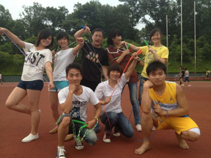 11月25日下午,淮南職業(yè)技術(shù)學院的足球場上,十余人飛舞著繩子,有單人跳,也有三、五人一起跳,陣陣歡笑聲飄蕩在球場上空。休息時分,記者見到了跳繩愛好者,也是組織者——熊作偉。他雖然年過40,但因為經(jīng)常運動的原因,顯得比實際年紀小了10來歲!拔覐男【拖矚g跳繩,一直斷斷續(xù)續(xù)地跳著,可能是出于對跳繩有著難以割舍的情懷,后來,從網(wǎng)絡上了解到跳繩有多種花樣,就開始潛心研究,跳出各種花式跳繩!毙茏鱾ヒ贿呎f,一邊從包里掏出各種各樣的繩子!斑@是竹節(jié)繩,適合單人跳;這是速度繩,比賽用的;這是牛筋繩,多人跳的……,繩子還有3.6米長的、7米長的……”談起繩子,熊作偉滔滔不絕。