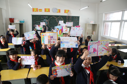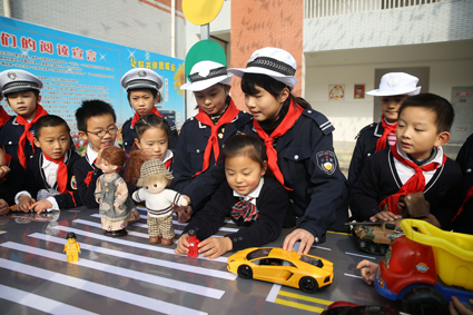 圖一:孩子們在模擬如何文明過馬路。 圖二:孩子們用作畫的方式倡導文明交通。