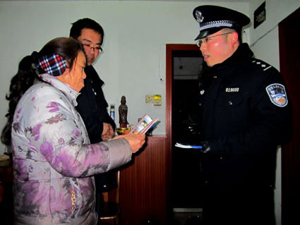 近日,淮南市公安局國(guó)慶路派出所民警前往該所轄區(qū)二汽小區(qū),向小區(qū)居民發(fā)放防范盜竊等宣傳材料。在一戶居民家中,民警向該住戶做了防范詐騙和盜竊等的必要提醒。(如圖)