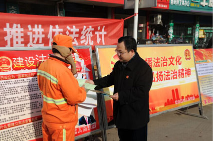 12月4日上午,謝家集區(qū)人民法院的法官正向一名環(huán)衛(wèi)工人發(fā)放法律法規(guī)宣傳資料。當(dāng)天,該院的法官們走上街頭積極參加法制宣傳活動。法官們通過發(fā)放宣傳單、現(xiàn)場解答等方式,宣傳憲法知識等法律法規(guī);顒又,共向市民發(fā)放各種普法資料450余冊,解答法律咨詢35人次,受到了人民群眾的好評。