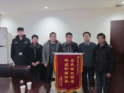 圖:農(nóng)民工為市農(nóng)民工維權(quán)服務(wù)中心送上錦旗