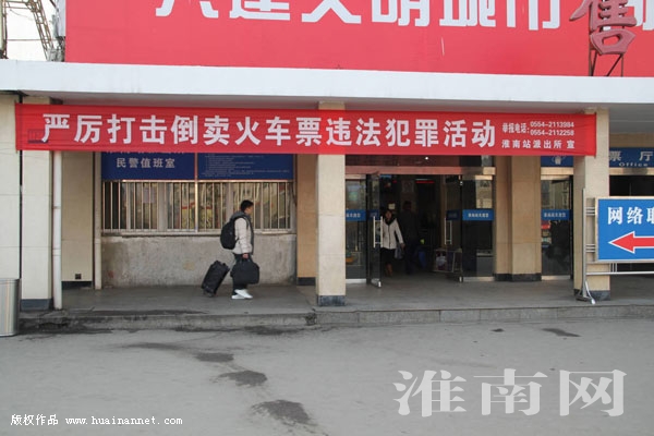12月14日上午,淮河早報、淮南網(wǎng)記者在淮南火車站看到,鐵路派出所已在售票大廳門前拉起打擊倒賣車票違法犯罪活動的宣傳橫幅,同時有民警正在幾處顯眼位置上張貼宣傳告示,橫幅和告示上均留下了舉報電話。