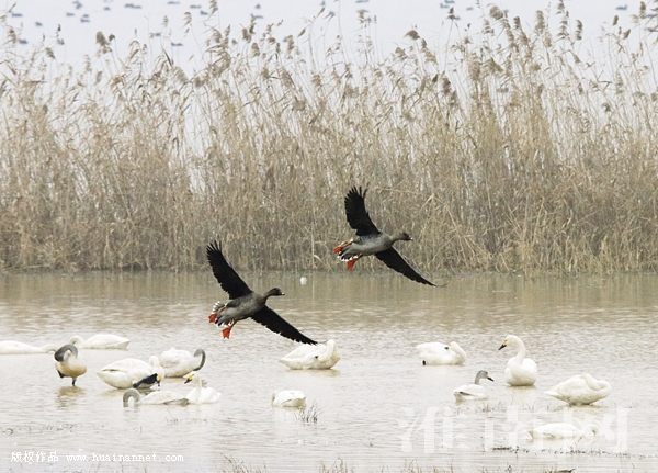 圖二:兩只豆雁(國(guó)家二級(jí)保護(hù)動(dòng)物)在水面上飛翔。