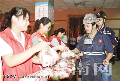 中秋節(jié)期間,中煤新集口孜東礦在井口為一線職工發(fā)放蘋果、面包、牛奶等節(jié)日慰問品,讓全體職工過一個(gè)歡樂祥和的佳節(jié)。圖為該礦女工協(xié)安員在井口為職工發(fā)放慰問品。(通訊員 陳正飛)