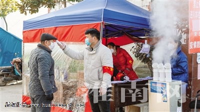 “社區(qū)吹哨、黨員報(bào)到”活動(dòng)開(kāi)展以來(lái),潘集區(qū)田集街道160余名在職黨員紛紛響應(yīng),迅速走進(jìn)23個(gè)社區(qū)協(xié)助開(kāi)展疫情防控工作。圖為黨員志愿者為出入小區(qū)的居民測(cè)量體溫。(通訊員 劉群)